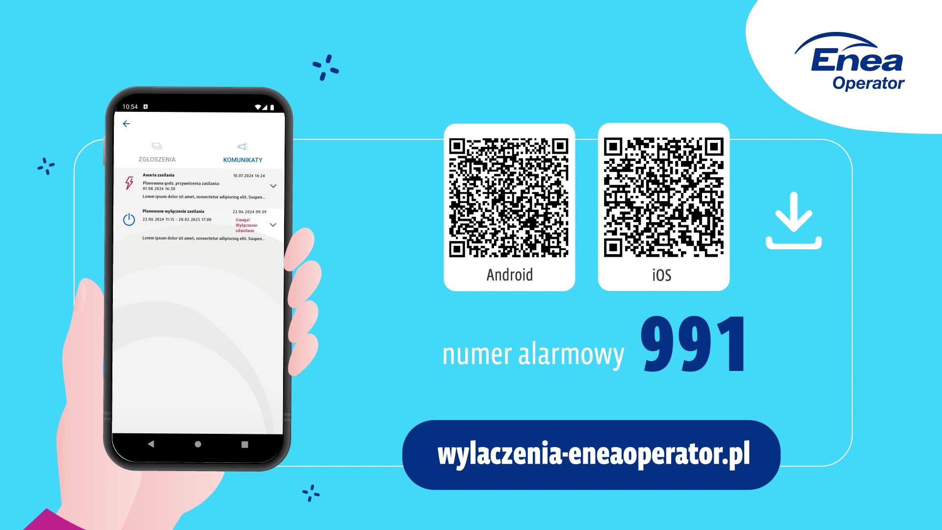 - aplikacja Enea Operator 991 - to funkcjonalna aplikacja na smartfony. Ułatwia prostą komunikację między Klientem, a spółką w zakresie zgłoszenia braku zasilania, a także umożliwia przekazanie informacji o awariach, przewidywanym czasie ich usunięcia oraz o planowanych wyłączeniach.