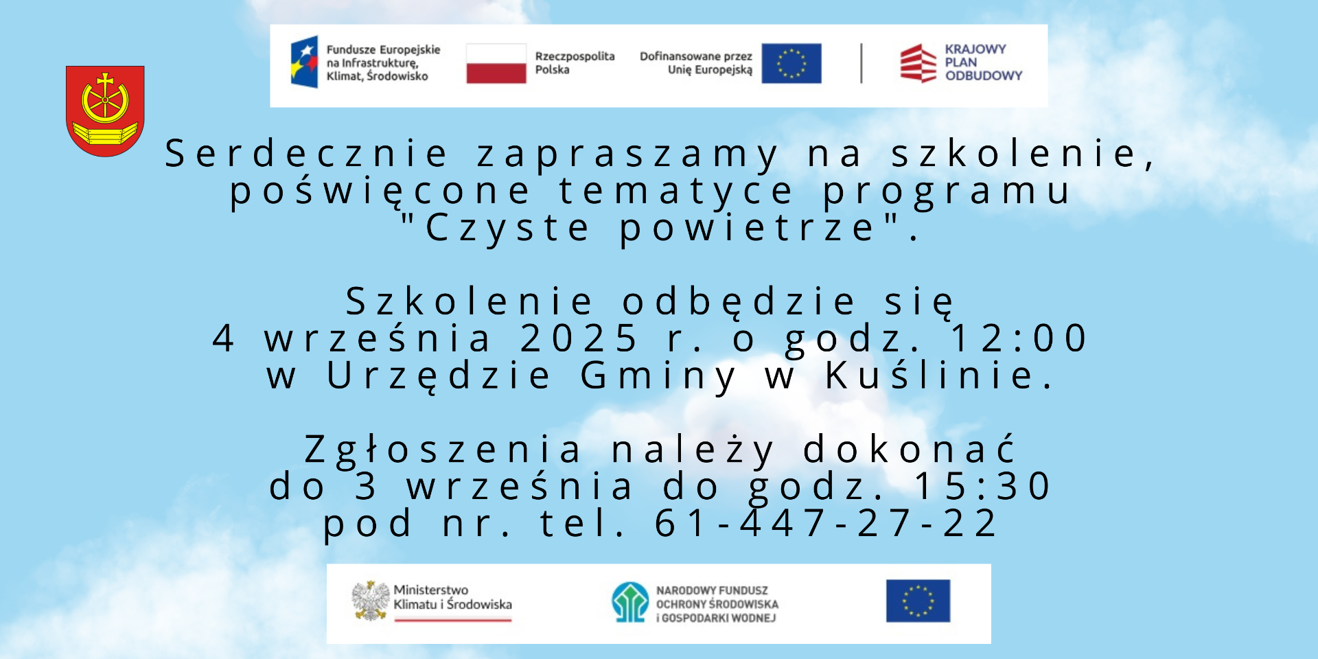 Szkolenie odbędzie się 4 września 2025 r. o godz. 12:00 w Urzędzie Gminy w Kuślinie.