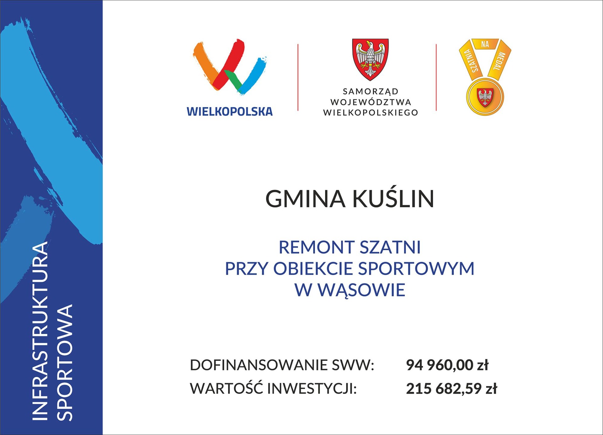 Realizacja zadania pn. „Remont szatni przy obiekcie sportowym w Wąsowie” był możliwy dzięki pozyskanemu dofinansowaniu w kwocie 96.140,00 zł w ramach programu „Szatnia na Medal”, realizowanego przez Samorząd Województwa Wielkopolskiego.