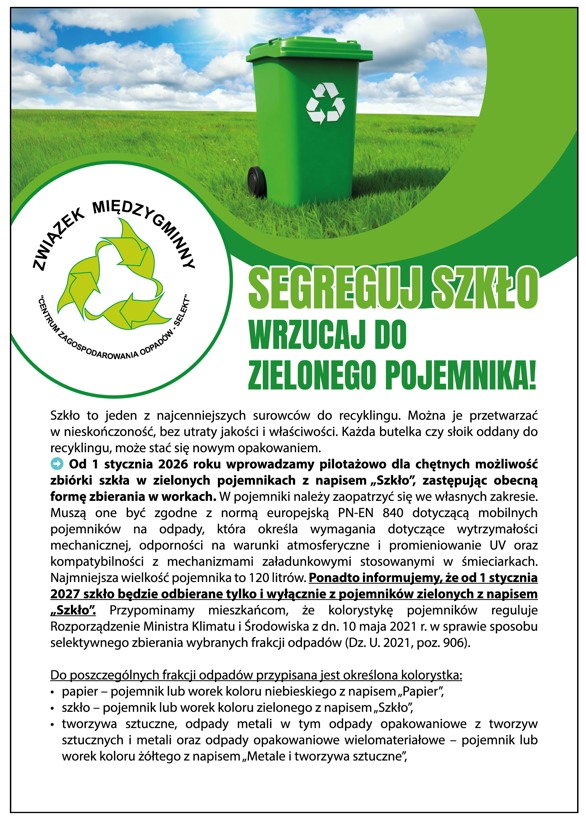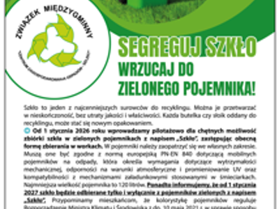 Od 1 stycznia 2026 roku wprowadzamy pilotażowo dla chętnych możliwość zbiórki szkła w zielonych pojemnikach z napisem „Szkło", zastępując obecną formę zbierania w workach.