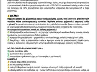 Odpady szklane do pojemnika należy wrzucać tylko luzem, bez używania plastikowych worków, które zanieczyszczają surowiec.