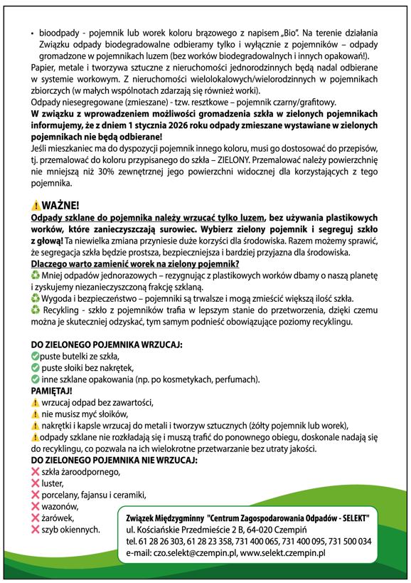 W związku z wprowadzeniem możliwości gromadzenia szkła w zielonych pojemnikach informujemy, że z dniem 1 stycania 2026 roku odpady zmieszane wystawiane w zielonych pojemnikach nie będą odbierane!