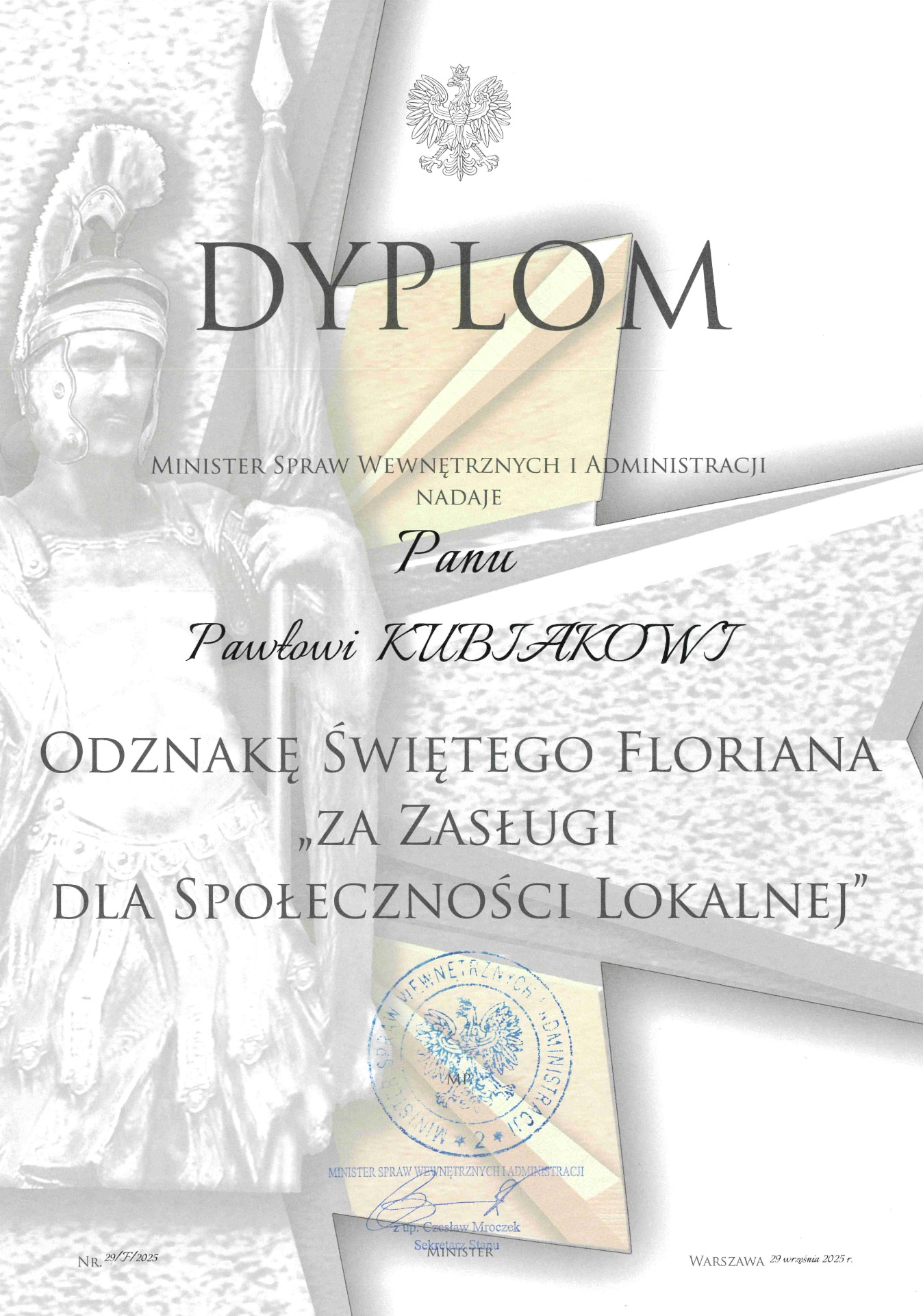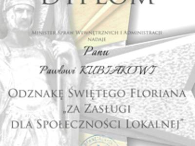 Na wniosek Komendanta Powiatowego PSP w Nowym Tomyślu bryg. Sebastiana Kozłowskiego, odznakę Świętego Floriana „Za zasługi dla lokalnej społeczności” otrzymał Wójt Gminy Kuślin Paweł Kubiak. Odznaczenie nadane przez Ministra Spraw Wewnętrznych i Administracji wręczyli Wicewojewoda Wielkopolski Pan Jarosław Maciejewski, Wielkopolski Komendant Wojewódzki PSP st. bryg. Jacek Strużyński oraz Dyrektor Zarządu Wykonawczego Oddziału Wojewódzkiego ZOSP RP w Poznaniu dh Mariusz Roga.