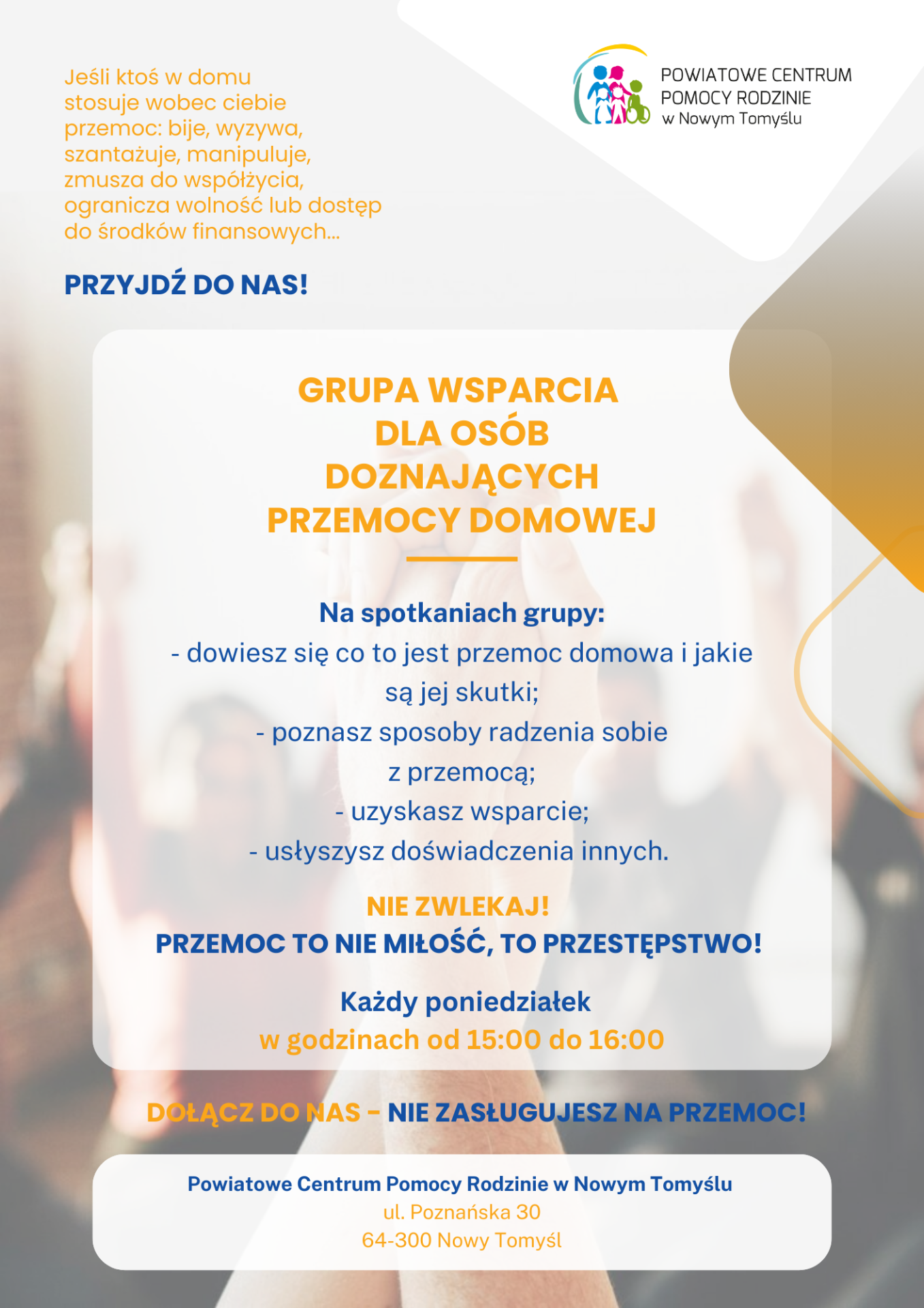Powiatowe Centrum Pomocy Rodzinie w Nowym Tomyślu prowadzi grupę wsparcia dla osób doświadczających przemocy domowej.