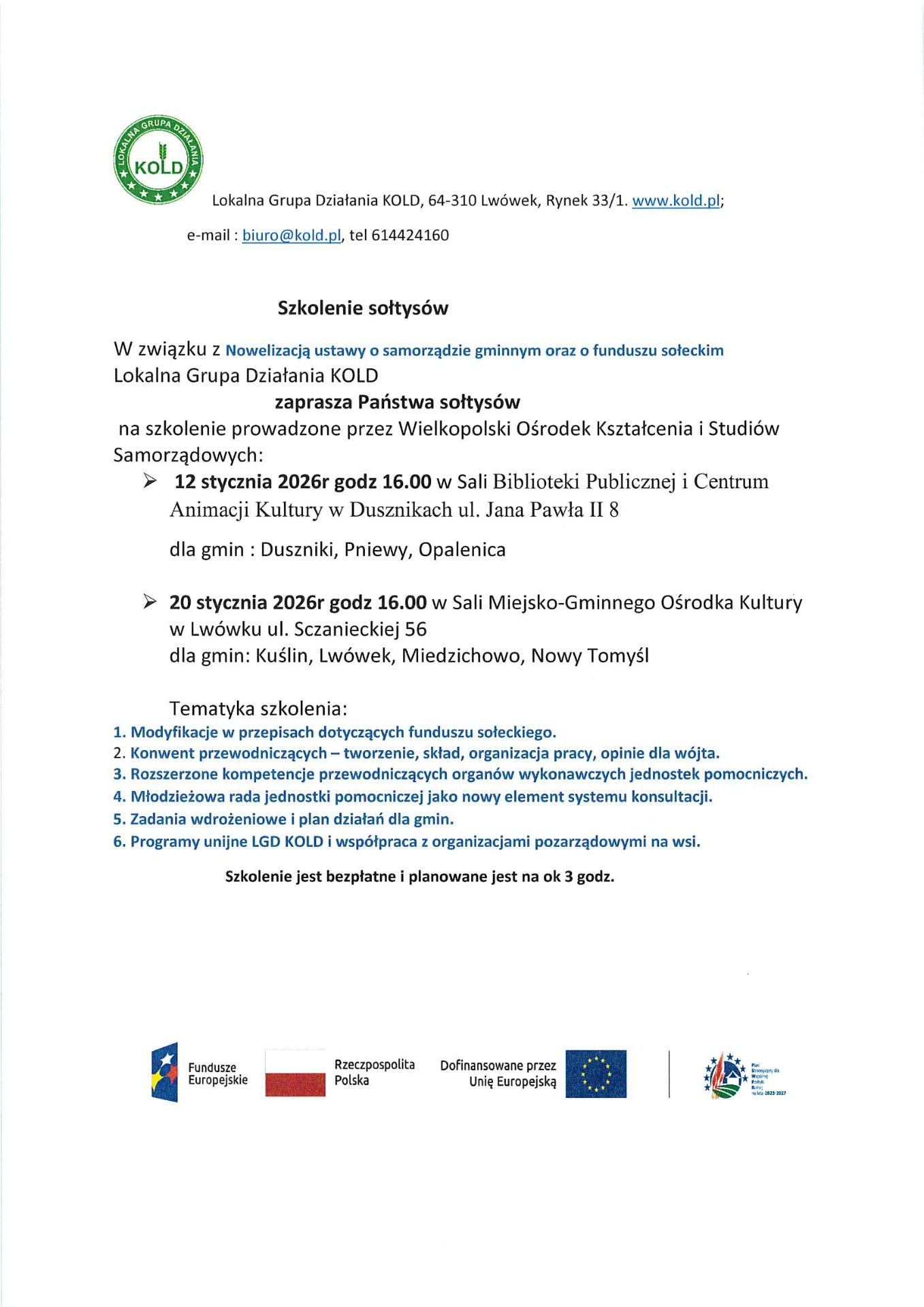 zaprasza Państwa sołtysów na szkolenie prowadzone przez Wielkopolski Ośrodek Kształcenia i Studiów Samorządowych.