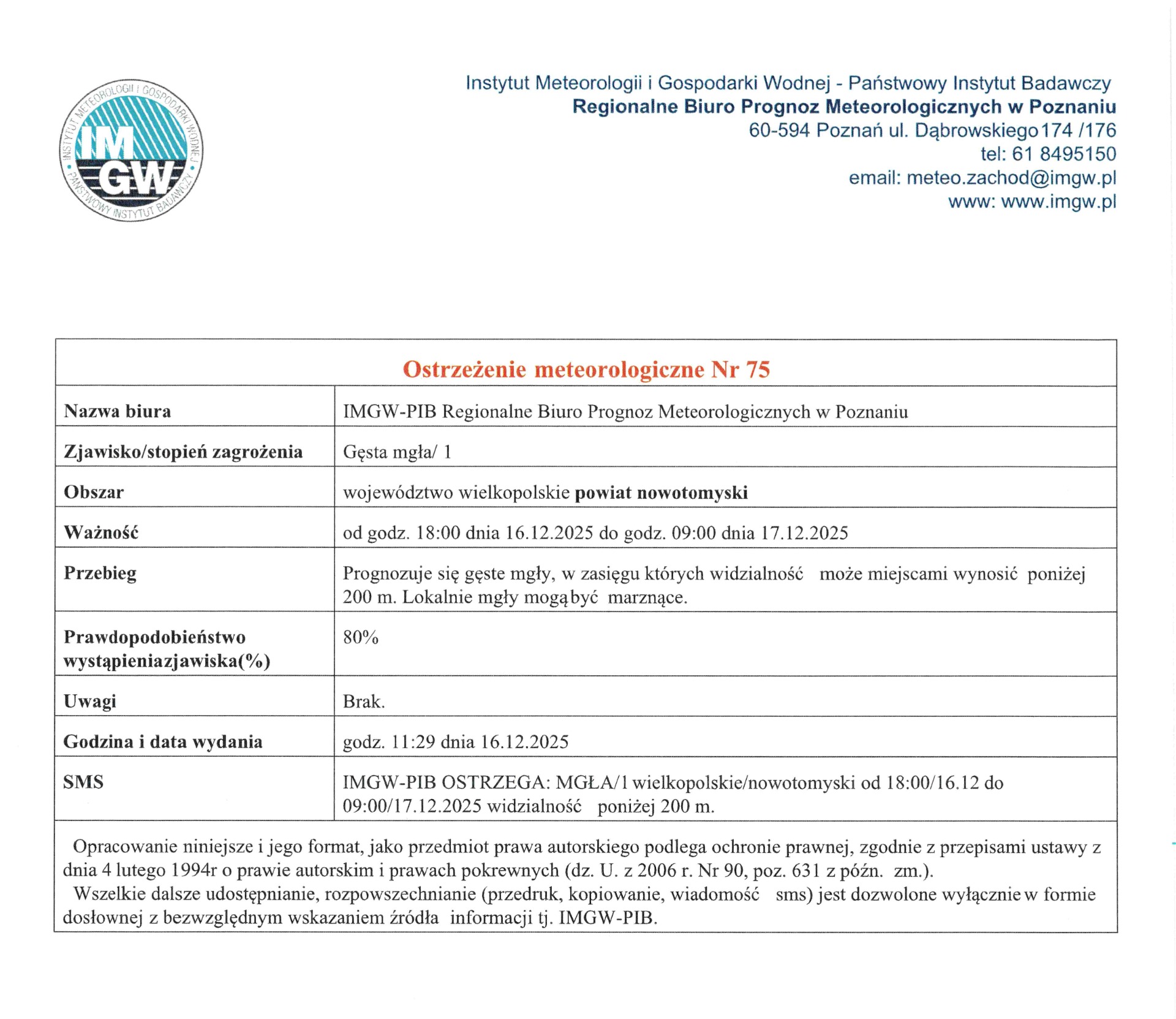 KOMUNIKAT OSTRZEGAWCZY METEO - GĘSTA MGŁA