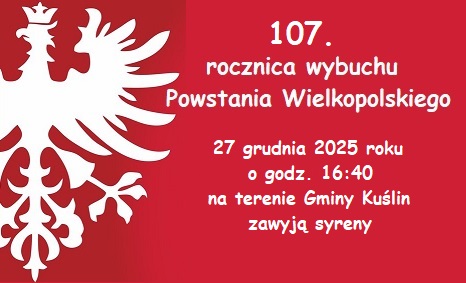 W ramach treningów i ćwiczeń dotyczących systemu alarmowania, celem jednoczesnego upamiętnienia 107 rocznicy wybuchu Powstania Wielkopolskiego, w dniu 27 grudnia 2025 roku o godz. 16:40 na terenie Gminy Kuślin nadany zostanie akustyczny sygnał alarmowy (syrena) trwający 1 min.