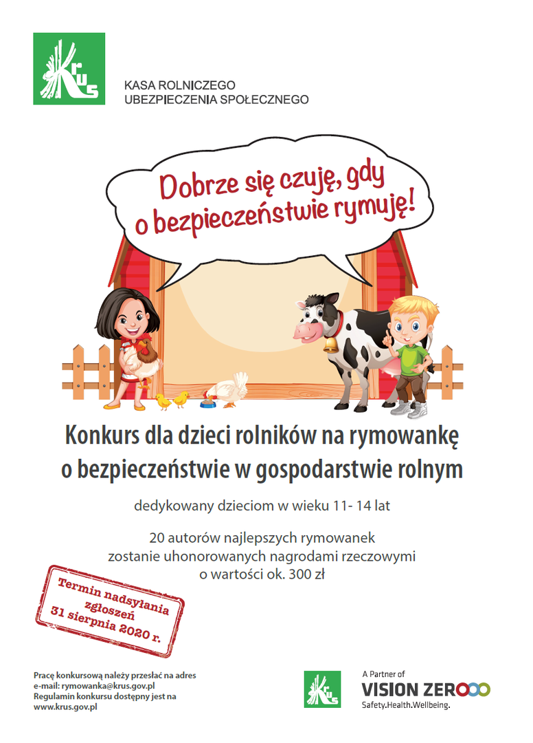 Placówka Terenowa KRUS w Nowym Tomyślu informuje, że na stronie internetowej www.krus.gov.pl została ogłoszona pierwsza edycja konkursu dla dzieci rolników na rymowankę o bezpieczeństwie w gospodarstwie rolnym.