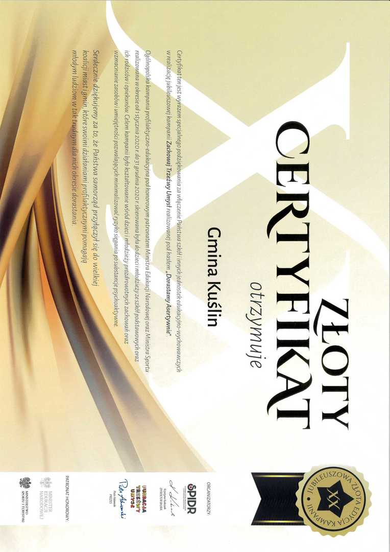 Podziękowania dla Gminy Kuślin za realizację kampanii Zachowaj Trzeźwy Umysł 2020