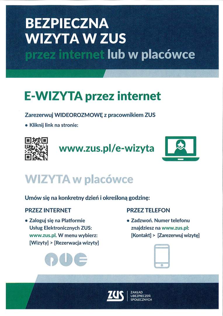 w trosce o bezpieczeństwo klientów, Zakład Ubezpieczeń Społecznych uruchomił usługę e-wizyt oraz możliwość rezerwacji wizyty w placówce Zakładu.