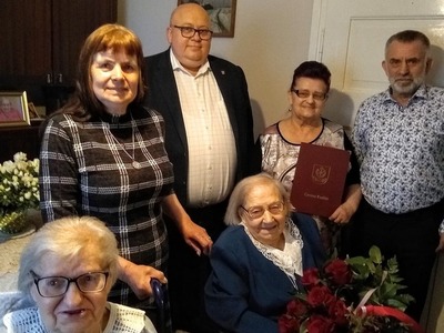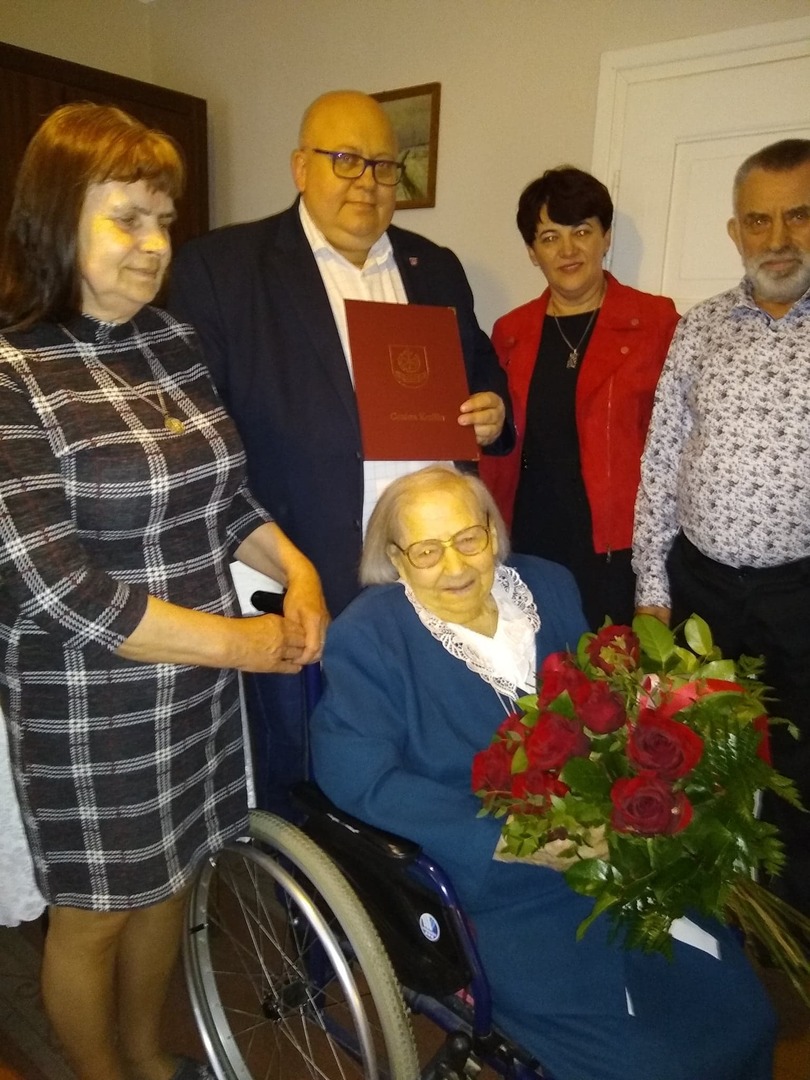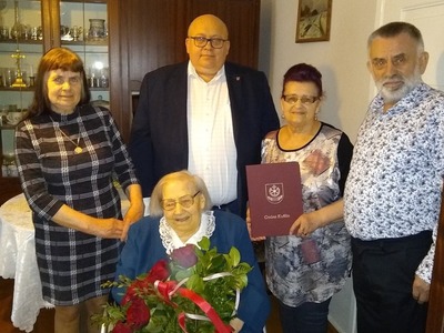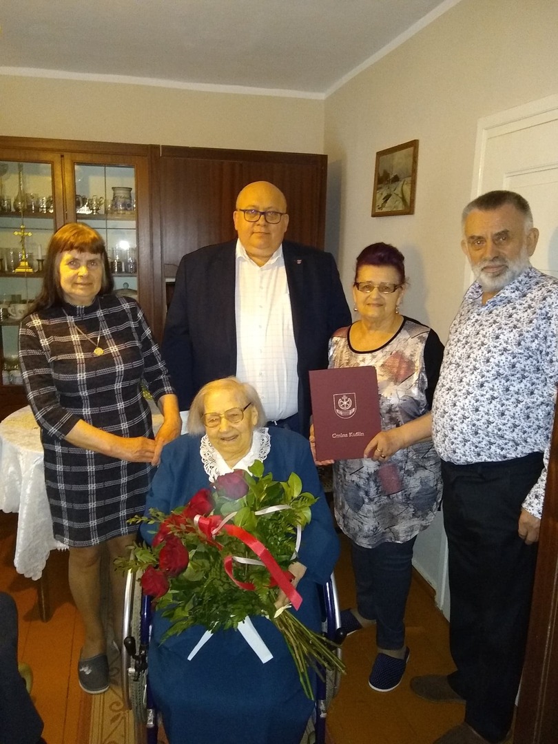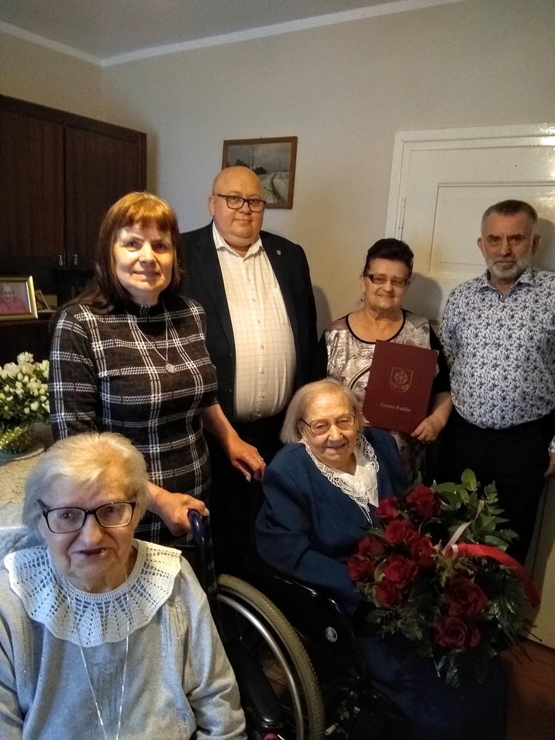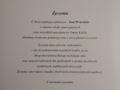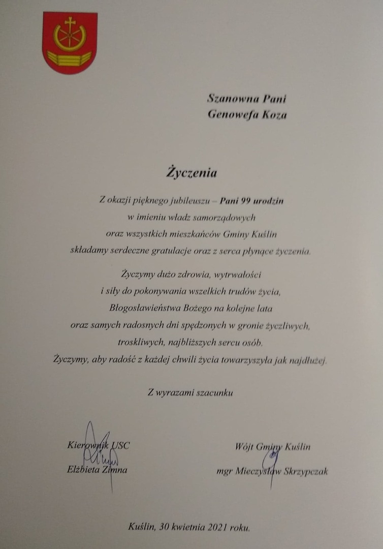Z tej okazji Wójt Gminy Kuślin Mieczysław Skrzypczak oraz Kierownik Urzędu Stanu Cywilnego Pani Elżbieta Zimna z wielkim zaszczytem, ogromną radością i wzruszeniem osobiście złożyli Jubilatce najserdeczniejsze gratulacje i życzenia.
