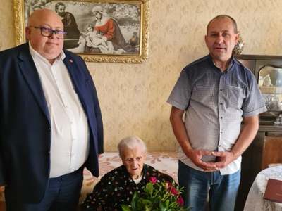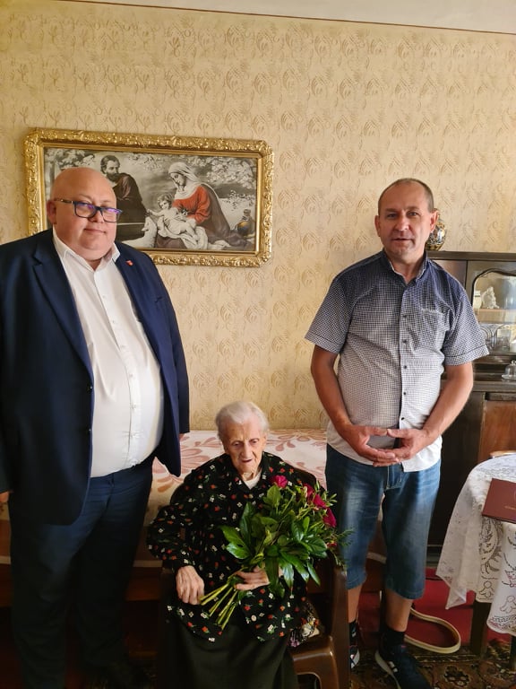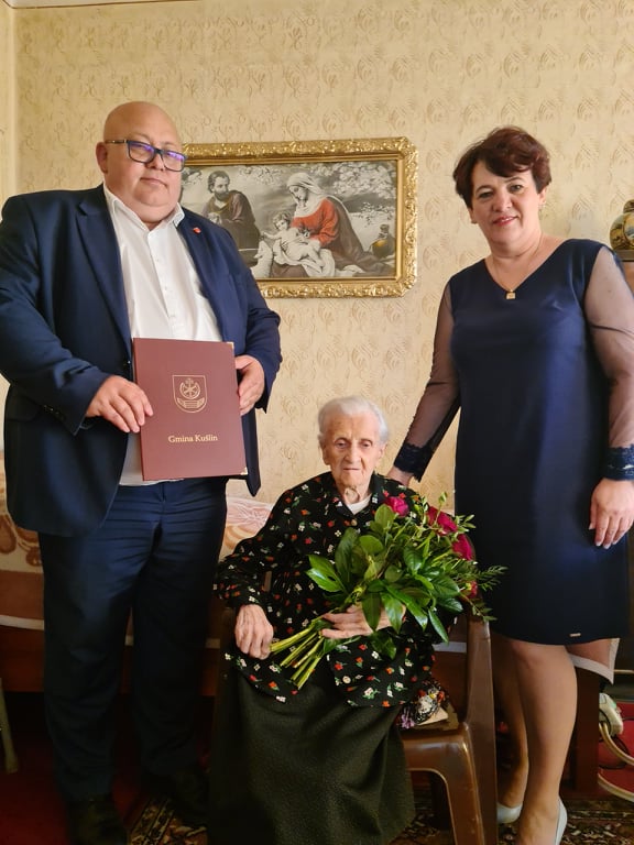 Z tej okazji Wójt Gminy Kuślin Mieczysław Skrzypczak oraz Kierownik Urzędu Stanu Cywilnego Pani Elżbieta Zimna z wielkim zaszczytem, ogromną radością i wzruszeniem złożyli osobiście Jubilatce najserdeczniejsze gratulacje i życzenia.