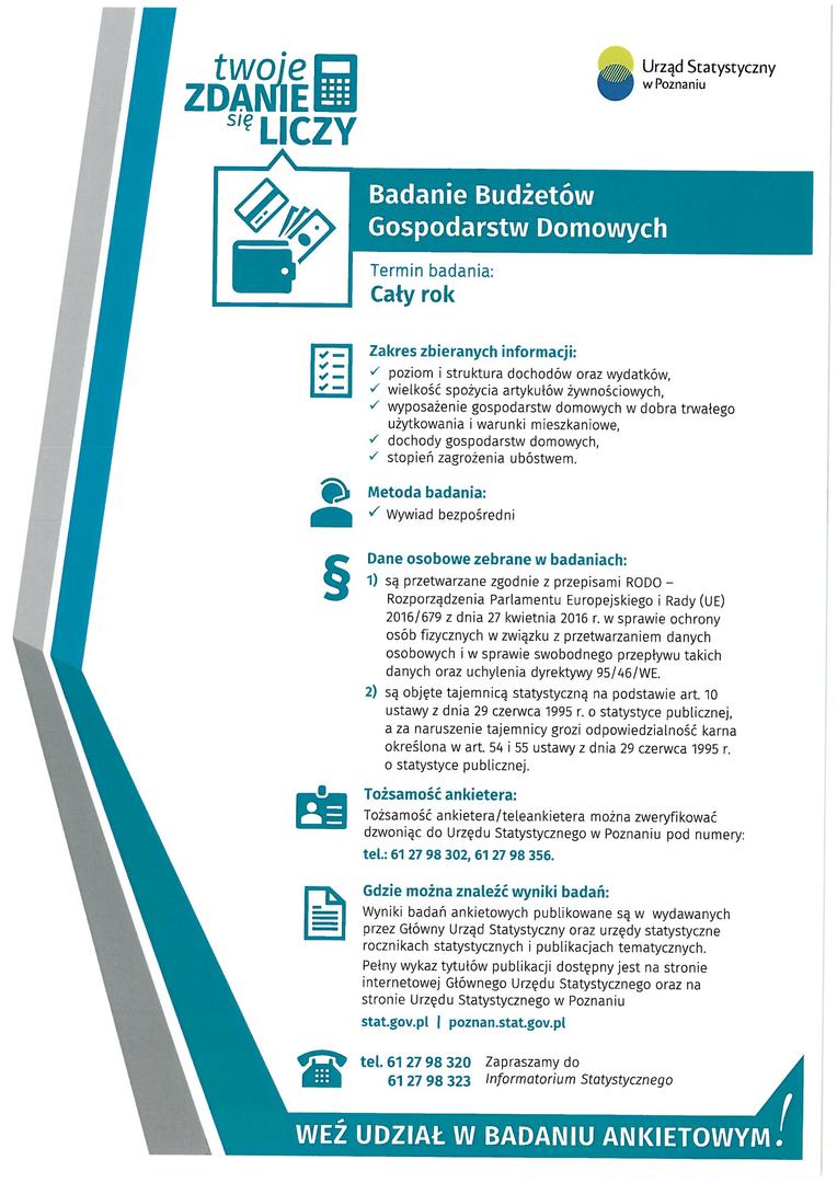 Dodatkowe informacje o badaniu dostępne są na http://stat.gov.pl/badania-gospodarstw-domowych-i-rolnicze/ oraz http://poznan.stat.gov.pl/aktualnosci/statystyczne-badania-ankietowe-styczen-2019,158,1.html