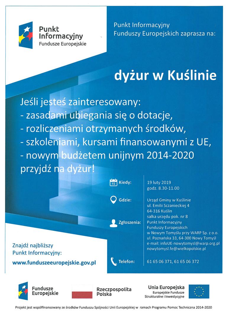 Uprzejmie informujemy, że dyżur, organizowany przez Punkt Informacyjny Funduszy Europejskich w Nowym Tomyślu (Mobilnym Punktem Informacyjnym) odbędzie się 19 lutego 2019 r. w godzinach 8.30-11.00 w Salce Urzędu Gminy w Kuślinie.