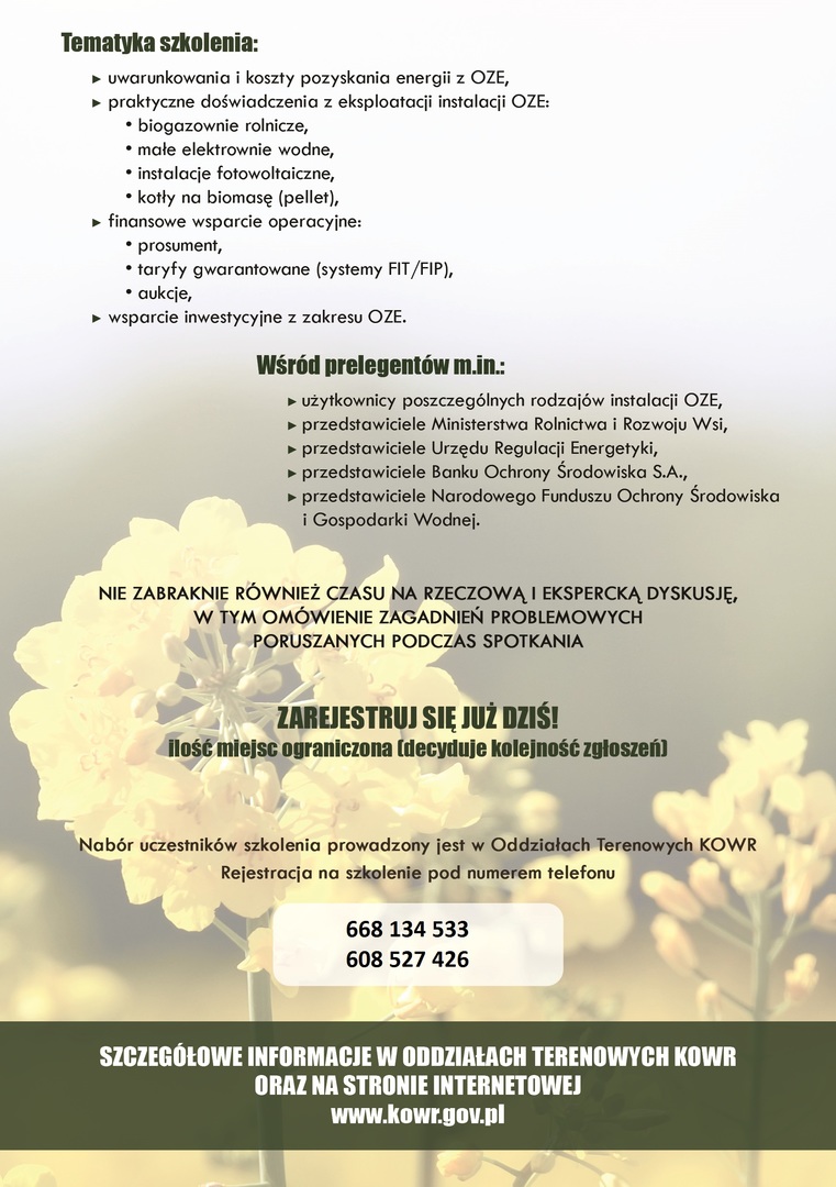 Bezpłatne szkolenie "OZE- SZANSA NA INNOWACYJNE ROLNICTWO"