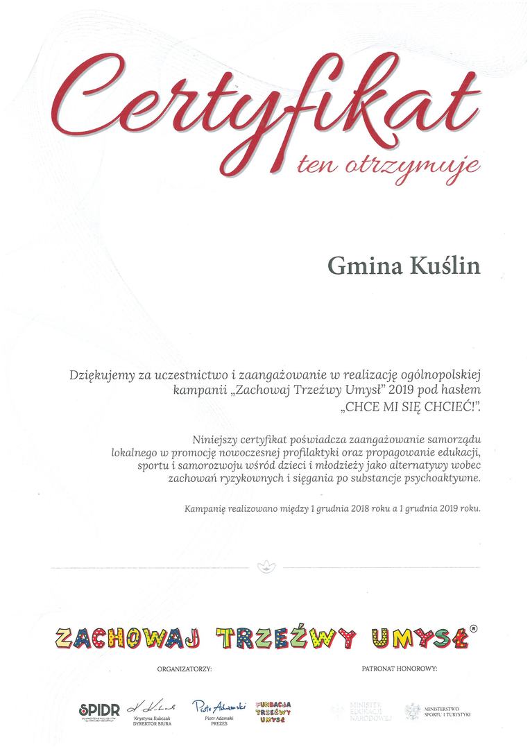 Gmina Kuślin otrzymała certyfikat za zaangażowanie Samorządu w ogólnopolską kampanię profilaktyczną „Zachowaj Trzeźwy Umysł 2019”