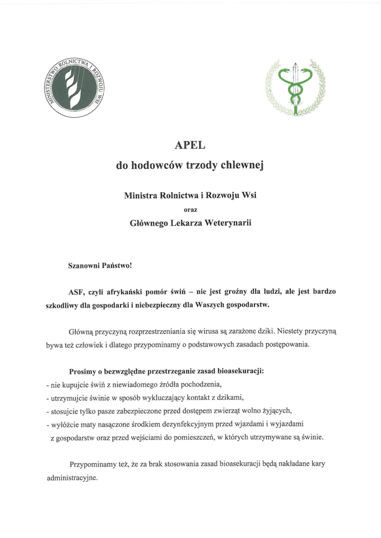W związku z pojawieniem się na terenie Wielkopolski w powiecie wolsztyńskim pierwszego przypadku zakażenia dzika wirusem afrykańskiego pomoru świń (ASF) Wójt Gminy Kuślin apeluje do wszystkich producentów trzody chlewnej z naszej gminy o podjęcie wyjątkowych środków ostrożności w celu ochrony gospodarstw przed wirusem. Szczegółowe zasady postępowania wobec zagrożenia wirusem ASF zostały umieszczone na stronie Głównego Inspektoratu Weterynarii https://www.wetgiw.gov.pl/nadzor-weterynaryjny/afrykanski-pomor-swin