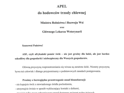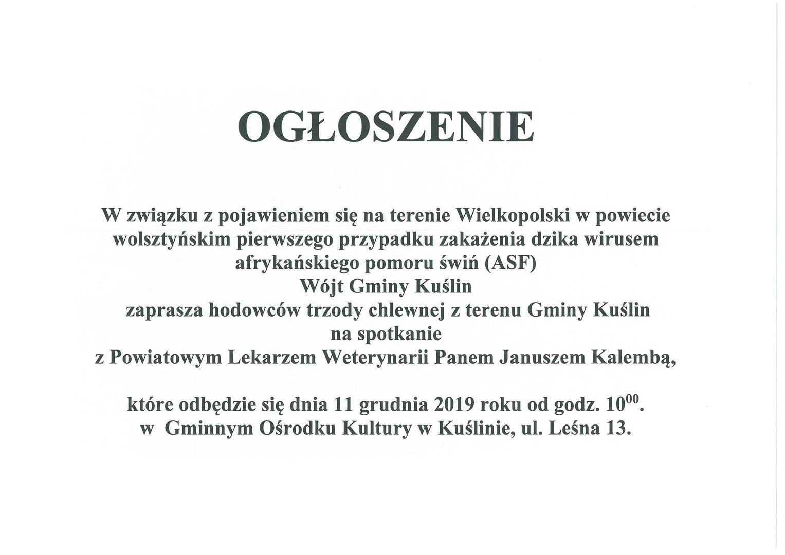 W związku z pojawieniem się na terenie Wielkopolski w powiecie wolsztyńskim pierwszego przypadku zakażenia dzika wirusem afrykańskiego pomoru świń (ASF) Wójt Gminy Kuślin zaprasza hodowców trzody chlewnej z terenu Gminy Kuślin na spotkanie z Powiatowym Lekarzem Weterynarii Panem Januszem Kalembą, które odbędzie się dnia 11 grudnia 2019 roku od godz. 10:00. w Gminnym Ośrodku Kultury w Kuślinie, ul. Leśna 13.