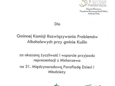 Podziękowania dla Gminnej Komisji Rozwiązywania Problemów Alkoholowych w Kuślinie.