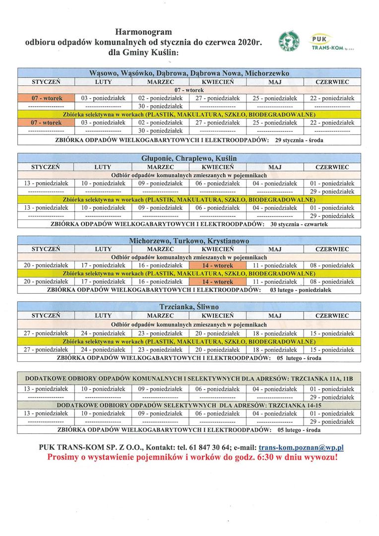 Harmonogram odbioru odpadów komunalnych od stycznia do czerwca 2020 r. dla Gminy Kuślin.