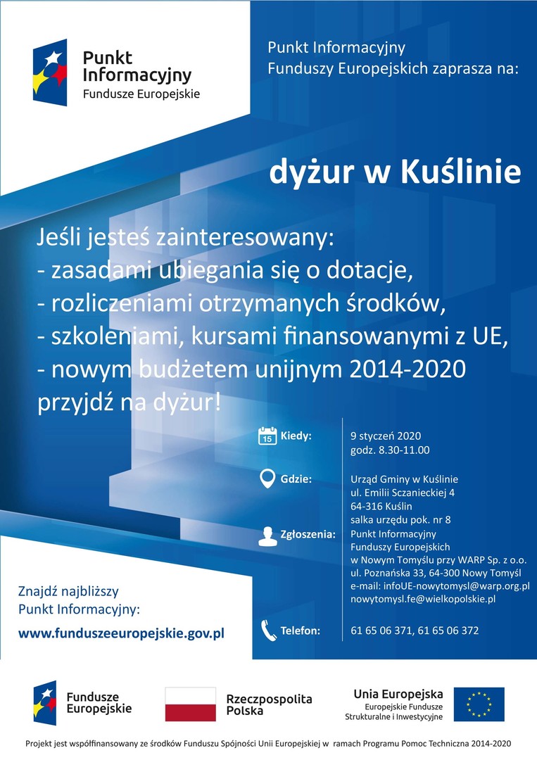 Punkt Informacyjny Funduszy Europejskich zaprasza na dyżur w Kuślinie.