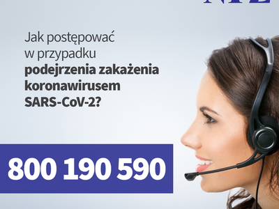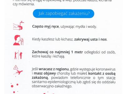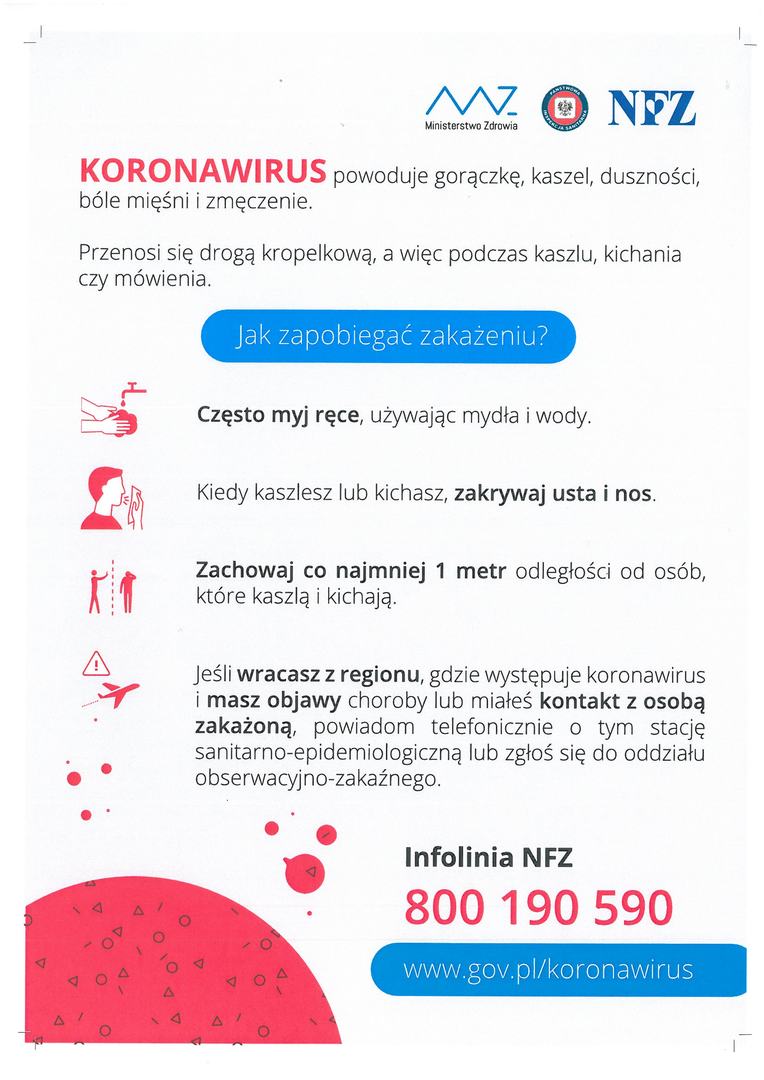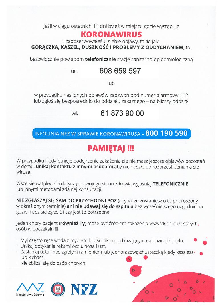 Informacja dotycząca działań jakie muszą podjąć pacjenci w przypadku podejrzenia zakażenia koronawirusem, jak również informację jak zapobiegać zakażeniu.