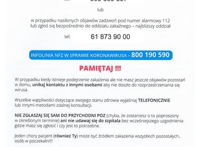 Informacja dotycząca działań jakie muszą podjąć pacjenci w przypadku podejrzenia zakażenia koronawirusem, jak również informację jak zapobiegać zakażeniu.