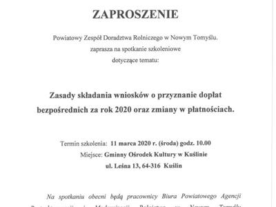 Powiatowy Zespół Doradztwa Rolniczego zaprasza na spotkanie szkoleniowe.