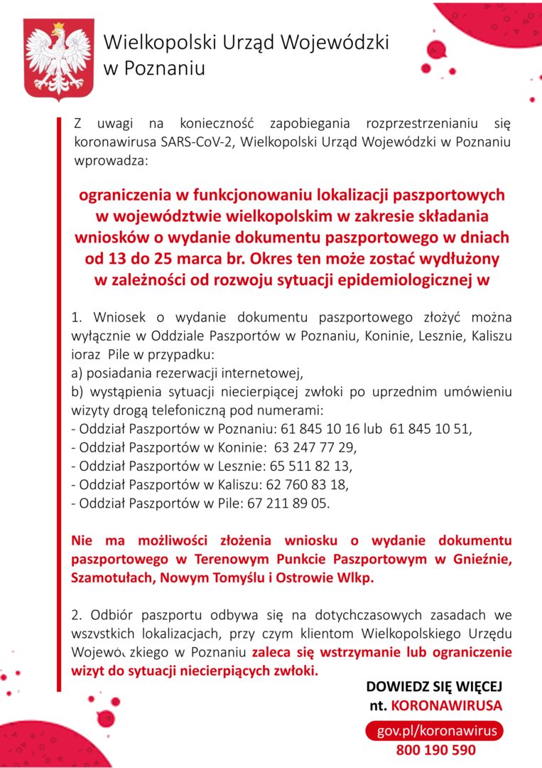 Informacja dotycząca ograniczenia w funkcjonowaniu lokalizacji paszportowych w województwie wielkopolskim.