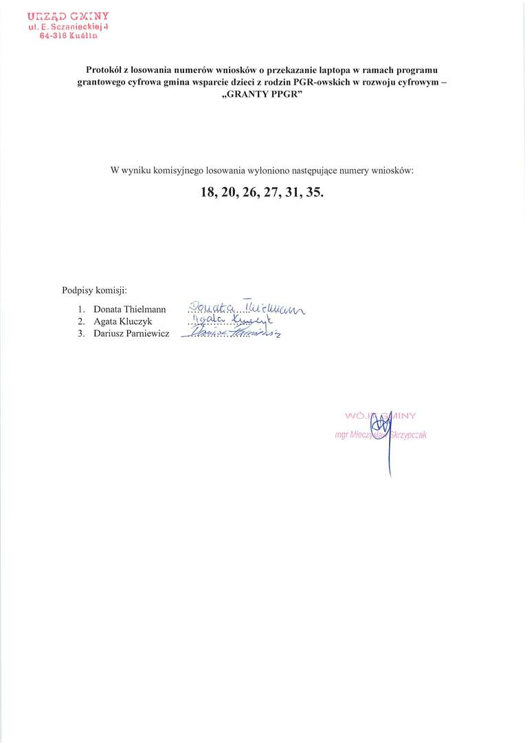W ramach Konkursu Grantowego Cyfrowa Gmina - Wsparcie dzieci z rodzin pegeerowskich w rozwoju cyfrowym – „Granty PPGR”, w wyniku komisyjnego losowania wyłoniono następujące numery wniosków: