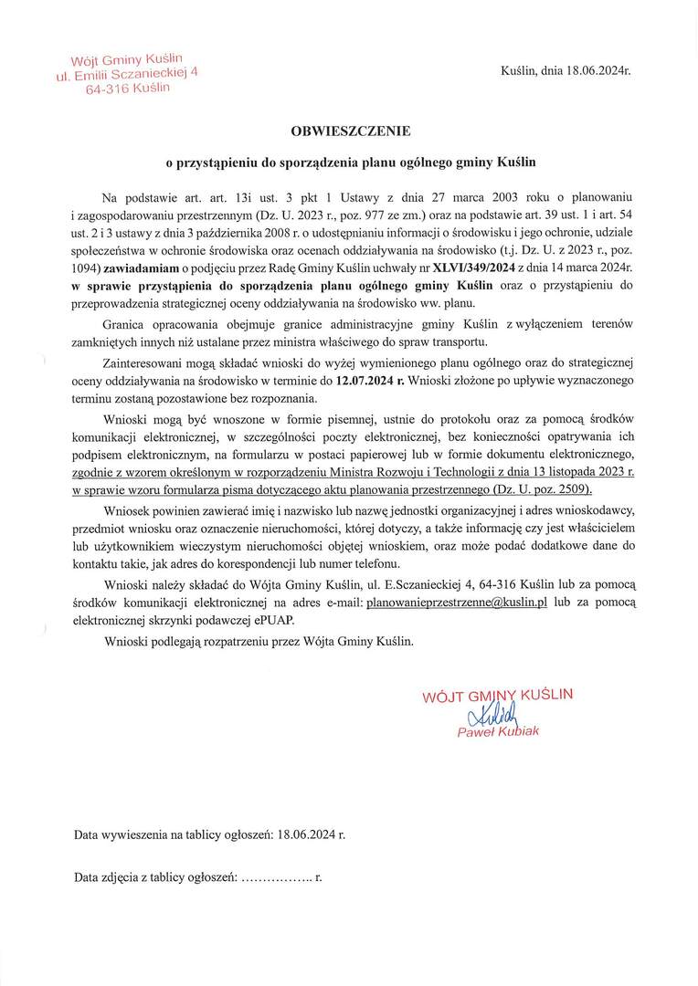 o podjęciu przez Radę Gminy Kuślin uchwały nr XLVI/349/2024 z dnia 14 marca 2024r. w sprawie przystąpienia do sporządzenia planu ogólnego gminy Kuślin oraz o przystąpieniu do przeprowadzenia strategicznej oceny oddziaływania na środowisko ww. planu.